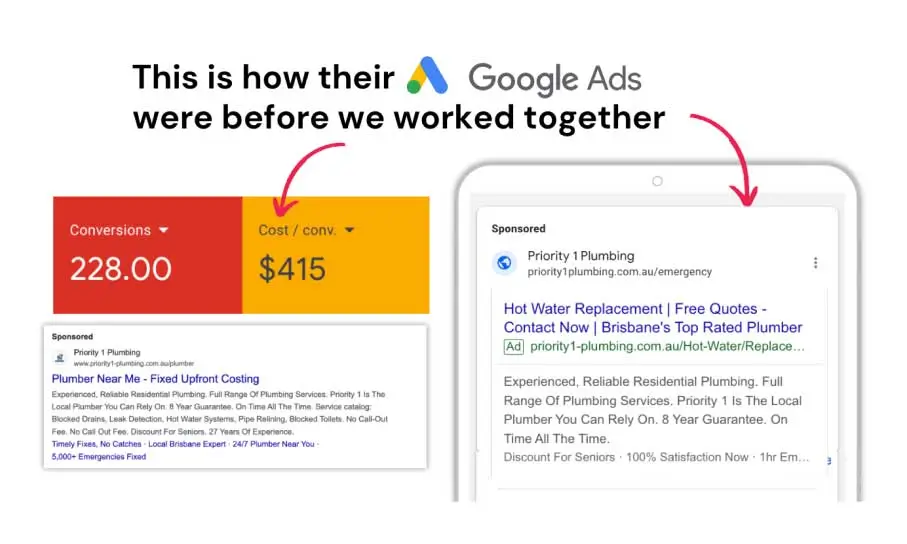 In just 14 days, Priority 1 Plumbing watched their lead costs go down by 82%. Now, we’ve managed to trim down their Cost per Conversion to around $58 — 86% less than the $415 that they used to spend per lead.